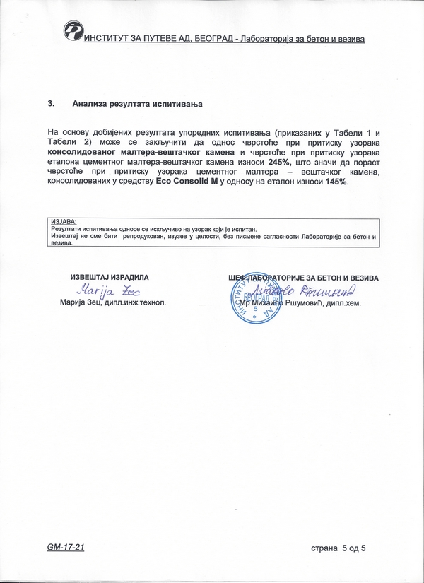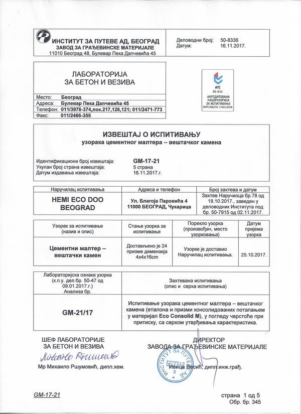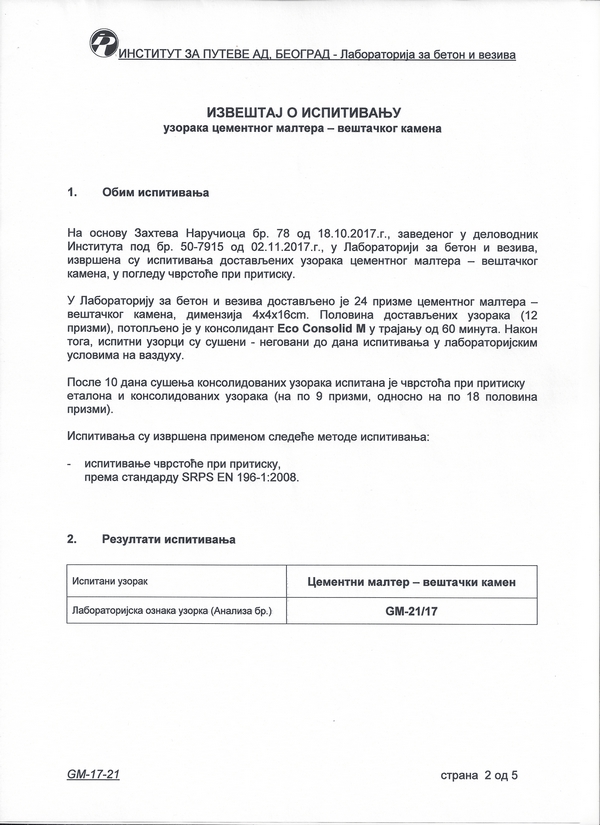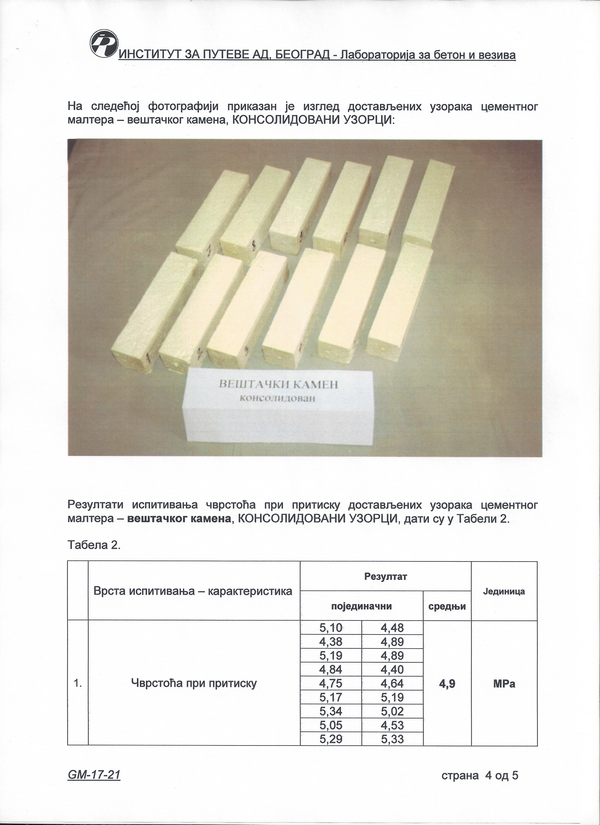 Институт за путеве а.д. - Београд: Цементни малтер - вештачки камен