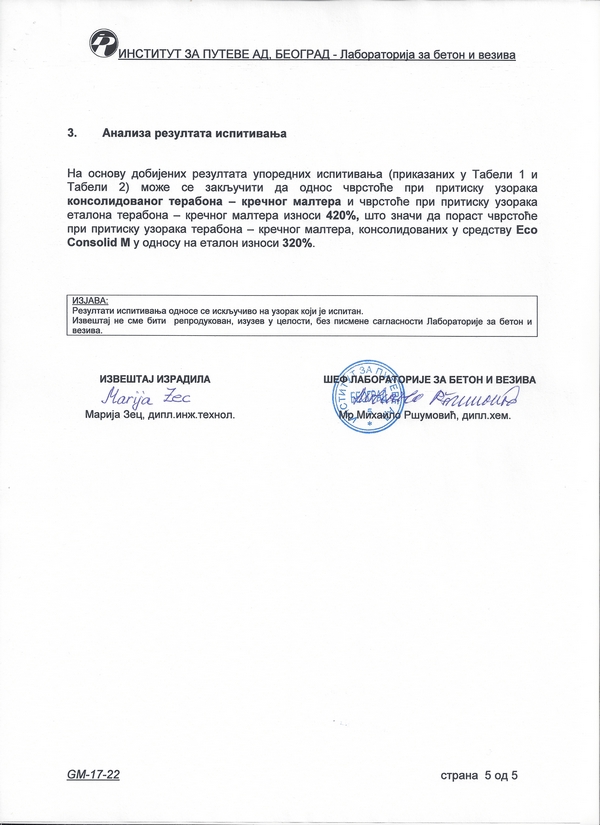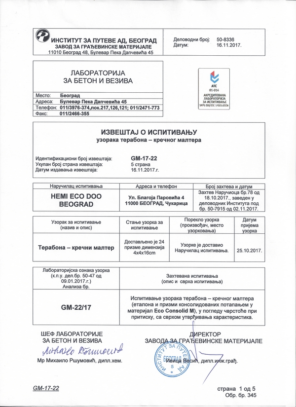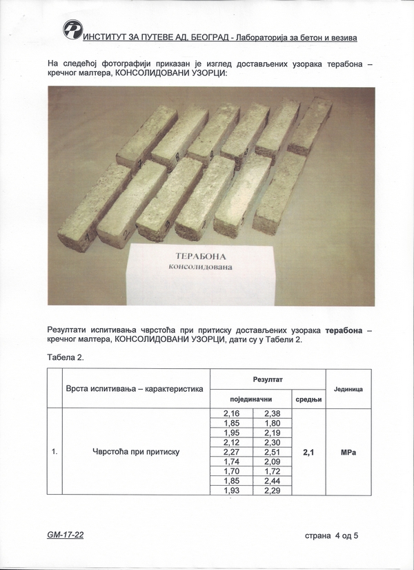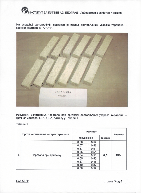 Институт за путеве а.д. - Београд: Кречни малтер - терабона