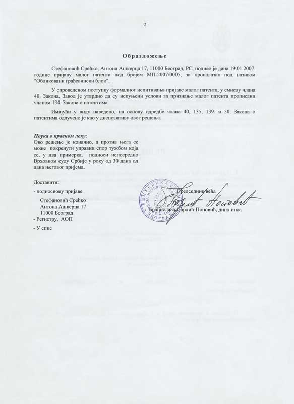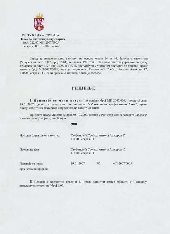 Обликовани грађевински блок припада области грађевинарства и то грађевинским елементима у облику блокова за опште грађевинске конструкције, који су саграђени од слојева различитих материјала заливених у носећи материјал. Користи се за изградњу зидова, преградних зидова, фасадних зидова и сл. Зидови се остварују једноставно слагањем грађевинских блокова, један преко другог, тако да им се уклапањем обликованих делова стабилише положај, при чему поједине шупљине које се тиме добијају могу бити испуњене носећим стубовима од бетона, или се кроз њих могу провлачити водоводне и канализационе цеви, електро и клима инсталације и сл. Обликовани грађевински блок својим новим обликом и конструкцијом предње (фасадне) и задње (ка унутрашњости објекта) стране решава проблем једноставне градње фасадних зидова и смањује трошкове њихове изградње. Применом обликованих грађевинских блокова остварују се добре топлотне и звучне изолације озиданих простора, а такође се решава, поједностављује и појефтињује проблем уградње и монтирања зидних електричних, водоводних и других инсталација без потребе накнадног обијања и разбијања зидова (тзв. штемовања).